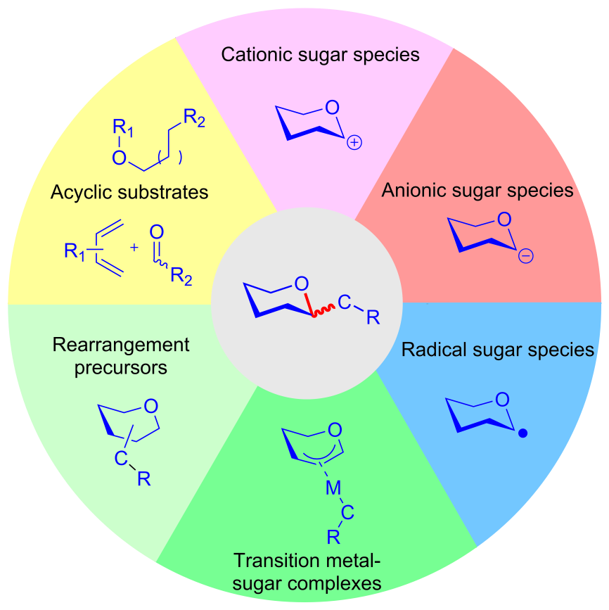 碳糖苷广泛存在于自然界,展现重要的生理活性。由于其对体内水解酶呈惰性,从而有潜力被开发成糖苷水解酶和转移酶的抑制剂以及一系列生物过程的调节剂等。以氧糖苷为先导物,通过设计和合成其碳糖苷类似物,已产生多个上市的钠–葡萄糖协同转运蛋白-2(SGLT-2)抑制剂,如达格列净、卡格列净和恩格列净等,用于治疗II型糖尿病。此外,碳糖苷玻色因(Pro-XylaneTM)作为抗衰老成分被广泛应用于护肤品中。本论文基于糖基给体类型来划分碳糖苷化反应,详细介绍了碳糖苷化反应中卤苷、糖烯、糖基乙酸酯、1,2-环氧糖、硫苷、亚砜苷、砜苷、硒苷、碲苷、糖基半缩醛、糖基内酯、糖基亚胺酯、糖基膦酸酯、甲苷等糖基给体经过糖基阳离子、阴离子、自由基或过渡金属配合物等中间体的反应机理及最新的研究进展。并且,该论文对形成碳糖苷的Claisen重排、Ramberg-Bäcklund重排、1,2-Wittig重排等重排反应,以及非环前体化合物分子内环化反应和Diels-Alder环加成等分子间环化反应进行了归纳和总结。论文中,作者重点论述了碳糖苷化反应中立体选择性的影响因素。最后,该文对碳糖苷领域存在的挑战及未来的发展前景进行了分析和展望。
