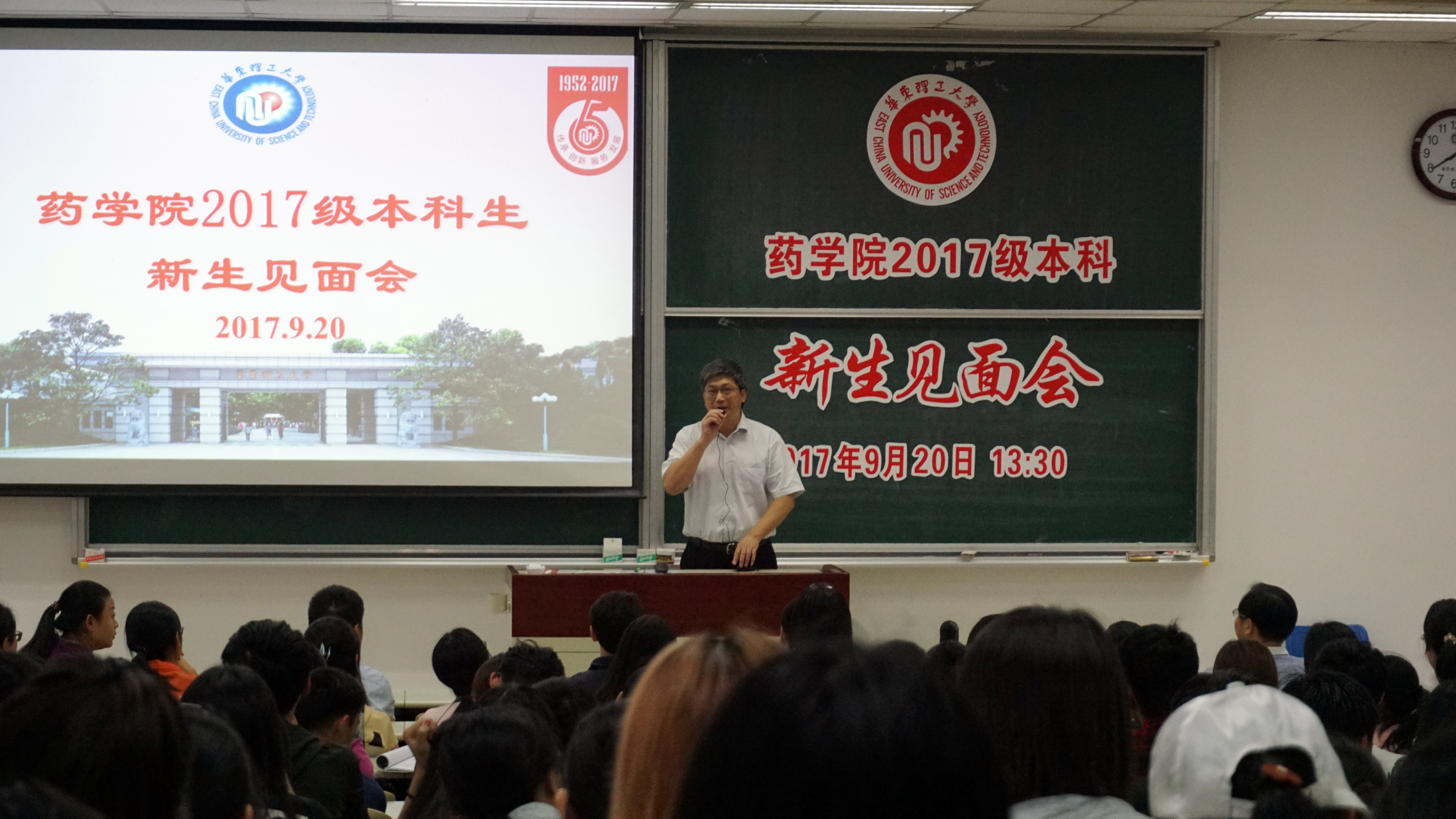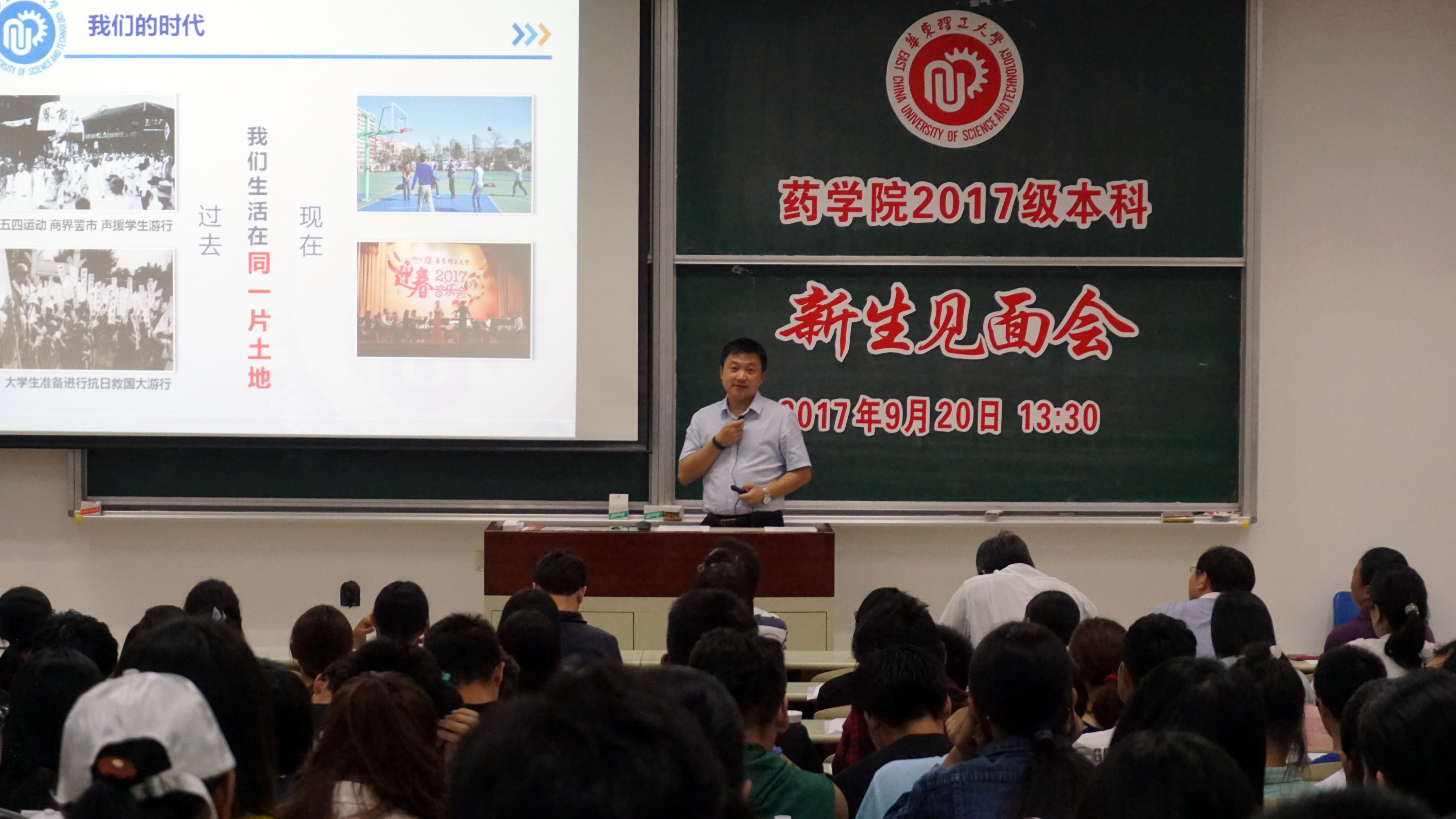 党委书记李剑以“我的华理,我的药院,我的大学”为题为新生带来一节生动的思政课。他从历史沿袭和校情概述等方面向同学们介绍了国产自拍