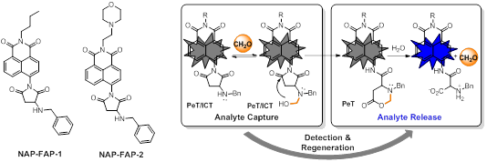 另一方面,荧光探针由于可方便、灵敏、实时对生物样品中的待测物进行检测及成像,近年来得到了广泛的发展和应用。传统的反应型荧光探针在荧光信号产生的过程中会引起待测物分子的消耗,从而影响其浓度和内平衡。因此,如何在荧光探针的设计中引入待测物补偿机制成为荧光探针研究领域目前所最关注的难点之一。针对这个难点问题,文章的作者提出了待测物再生荧光探针(Analyte Regeneration Fluorescent Probe)的概念,通过选择性捕获待测物,诱导探针的结构发生改变,产生荧光变化同时释放之前捕获的待测物分子。