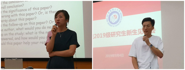 研究生培养情况,并就学术规范对同学们提出了严格的要求,希望新生诚实守信,脚踏实地做科研、做学问。青年教师代表梁欣从科研工作的敲门砖“文献阅读”的角度切入,为新生解析了“文献”的重要性,并就如何有效提取文献信息给予了许多有效的学习方法。学生代表曾任上海市学联副主席、校研究会主席的郭春阳同学,从课程学习、科研训练和学生工作三个层面与新生们分享了从自己的成长之路。