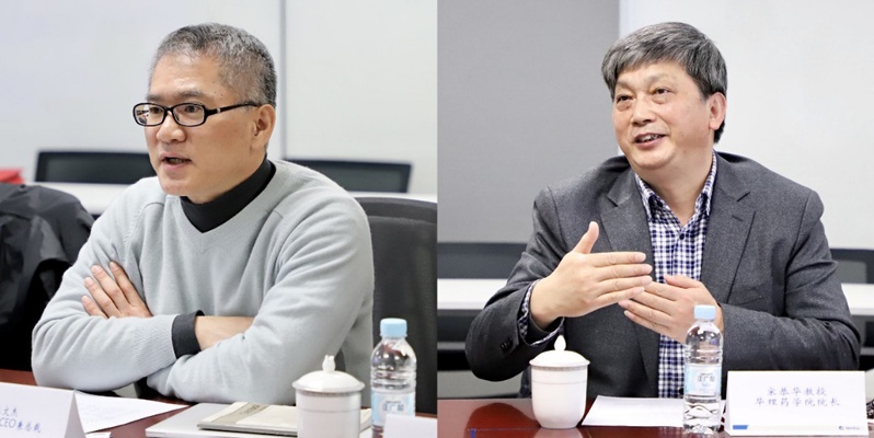 院长宋恭华,副院长任国宾,副院长邓卫平,院长助理马磊及实践基地责任老师赵建宏,复宏汉霖执行董事、首席执行官兼总裁张文杰先生,联合创始人、首席科学官姜伟东博士,高级副总裁兼董事会秘书郭新军先生,高级副总裁兼首席技术官许圣昌博士,高级副总裁兼首席运营官黄玮女士,人力资源执行总监黄心茗女士等双方代表出席了本次仪式。基于长期以来的友好交流和密切合作,双方达成共识,双方将设立产学研实践基地进行人才培养,通过举办企业开放日和组织毕业实习等形式,打造高价值的实践型人才,为企业研发、生产及质量等部门提供持续的人才储备,为校企间深入的产学研合作搭建高效平台。