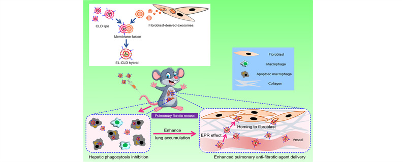 团队在前期针对纤维化肿瘤模型的脂质体靶向递药的研究基础上(ACS Nano, 13 (2019) 1751-1763),进一步开发了一种新型外泌体-脂质体杂合的递药系统,递药系统包载有巨噬细胞抑制剂氯膦酸二钠(CLD),CLD是第一代双磷酸盐,用于治疗骨质疏松症和溶骨性骨转移,CLD的脂质体能够被Kupffer细胞识别并吞噬,进而导致巨噬细胞凋亡,有效降低肝脏对纳米粒的吞噬能力。递药系统中成纤维细胞来源的外泌体成分能够使其归巢至肺纤维化部位,并进一步深入ECM。递药系统中进一步包载了抗纤维化药物尼达尼布,在改善肺纤维化模型小鼠肺功能和抑制肺纤维化的多个水平上都显示出明显的优于传统药物治疗的效果。相关成果“Clodronate-loaded liposomal and fibroblast-derived exosomal hybrid system for enhanced drug delivery to pulmonary fibrosis”,发表于生物材料期刊Biomaterials上(Biomaterials 271 (2021) 120761)。该研究设计的新型外泌体-脂质体杂合的递药系统有望为肺纤维化临床治疗提供新的思路。