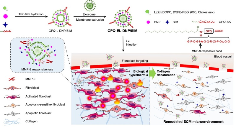 近期,国产自拍 高峰教授和陈彦佐副教授研究团队报道了一种用于负载线粒体解偶联剂2,4-二硝基苯酚(DNP),并经由GPQGIAGQR(GPO)4GG (GPQ)修饰的成纤维细胞来源的外泌体/脂质杂合纳米递药系统(GPQ-EL-DNP),结合生物热疗重塑细胞外基质(ECM)微环境,进而提高促凋亡药物辛伐他汀(SIM)的抗肺纤维化疗效。