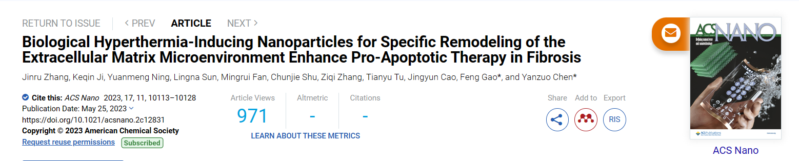 相关研究成果以Biological Hyperthermia-Inducing Nanoparticles for Specific Remodeling of the Extracellular Matrix Microenvironment Enhance Pro-Apoptotic Therapy in Fibrosis为题,在线发表于国际权威期刊《ACS Nano》上。2020级硕士研究生张金汝和季珂钦为共同第一作者,高峰教授和陈彦佐教授为通讯作者。该研究的成功实施,主要依托于上海市细胞代谢光遗传学技术前沿科学研究基地的支持和国家自然科学基金、上海市自然科学基金等项目的资助。