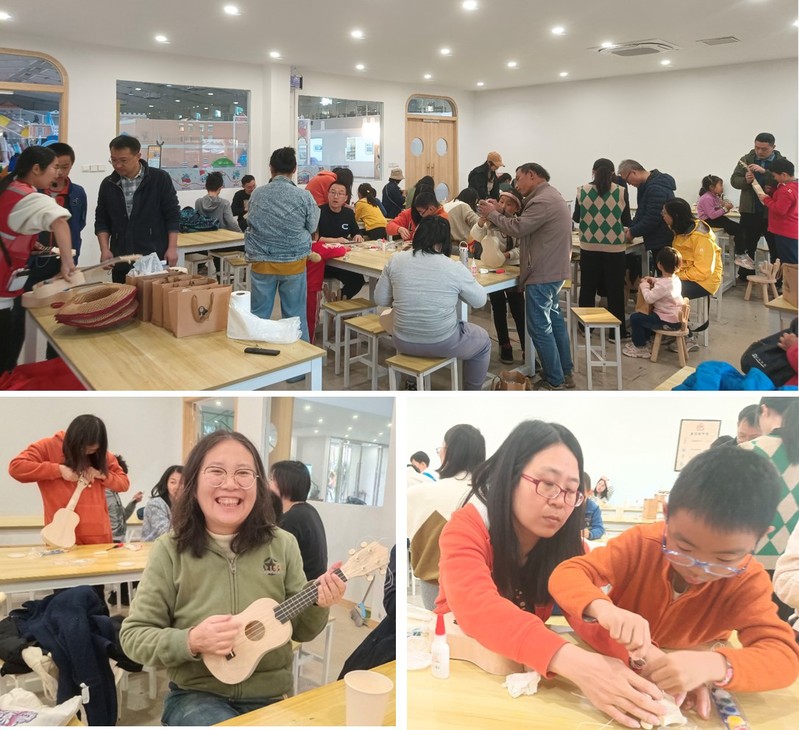 户外幽静的田园村庄,满眼是一片片的金色稻浪。教师们走进田野间,脚踏稻田,用传统方式收割水稻,体验使用传统工艺使稻穗分离,打谷脱粒,把一大把一大把的稻穗在拌桶中变成了金灿灿的谷粒。这种在金秋的稻田探寻稻香,享受收获的艰辛与乐趣,让大家感受到丰收的喜悦。在体验割稻谷的乐趣之后,大家还参与了手工制作榫卯小板凳和尤克里里的活动。