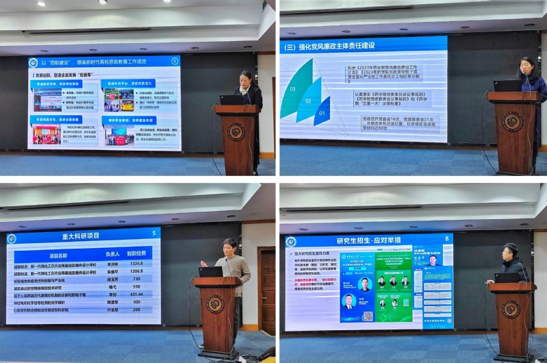 党委副书记王越、陈莉丽,副院长邵旭升、马磊和张敏分别就自己分管的学生思政工作、党建和纪委工作、科研和实验室安全、研究生教育、本科教学和校友等工作取得的成绩、面临的问题及2024年工作重点向全院教师进行了汇报。