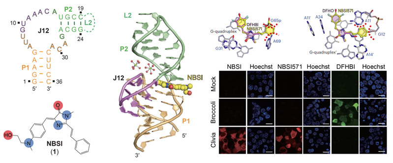 RNA具有独特的三维结构和种类繁多的生物学功能,广泛参与细胞的各类生命活动,与多种疾病的发生与发展密切相关。荧光RNA是近些年来发展起来的活细胞RNA成像技术。与荧光蛋白一样,研究人员只需要将荧光RNA的编码序列与靶标RNA编码序列融合,在细胞内表达后,即可对活细胞RNA进行标记成像。2023年杨弋、朱麟勇、陈显军以及任艾明课题组联合攻关,创新发展了Clivia系列大斯托克斯位移荧光RNA,具有高稳定性、高信噪比、高亮度,是目前唯一可用于活细胞分析的大斯托克斯位移荧光RNA,也是唯一可在活体上对RNA动态进行测量的荧光RNANature Methods, 2023, 20, 1563)。然而,Clivia和荧光染料NBSI的识别和发色机制仍不清晰,这个谜底的揭示不仅对于Clivia荧光RNA的进一步优化和应用拓展具有重要意义,还可以为更多具有特殊性能荧光RNA的创造提供新的思路。