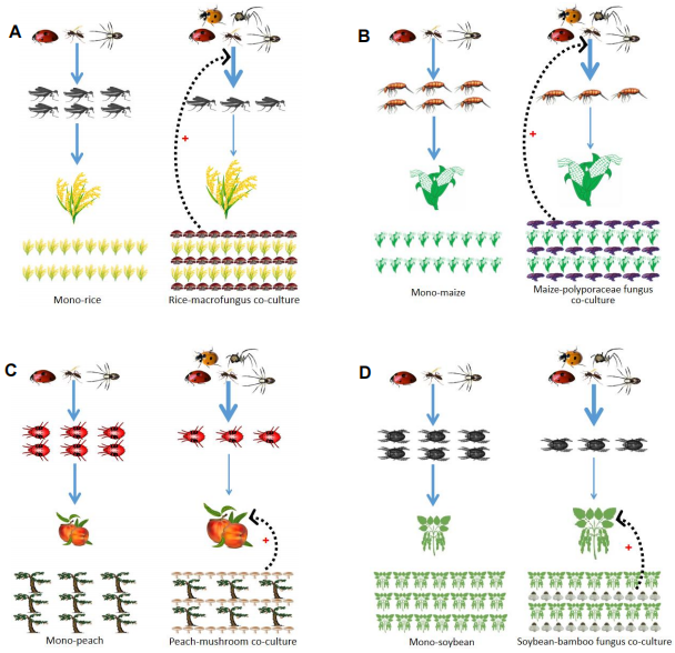 与作物多样性、作物与人类驯养动物共存的物种多样性相比,作物与食用菌共存的物种多样性(例如,葡萄园种灵芝、茶园种香菇、玉米间作蘑菇、水稻间作黑木耳),是保障食物安全和增加经济效益的重要技术。该技术在我国、巴西、埃及以及美国的一些地区,已被广泛采用。遗憾的是,学术界对该技术的控害机制知之甚少。针对当前研究空白,作者提出了两种假说:天敌假说(Natural enemy hypothesis)、作物抗性假说(Crop resistance hypothesis)(见图5)。