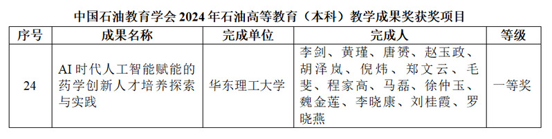 李剑教授等人完成的《AI时代人工智能赋能的药学创新人才培养探索与实践》获评石油高等教育(本科生)教学成果奖一等奖。该奖项实现了国产自拍