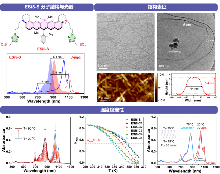 基于此,研究团队以前期基于硅罗丹明开发的共轭延长的高稳定性、高荧光亮度近红外染料二苯并硅罗丹明(ESi5)为基础,提出了一种晶体辅助聚集体合成方法(Crystal-Aided Aggregate SyntHesis, CAASH),成功构建了水溶性的短波红外染料聚集体。当阴离子为PF6-时,ESi5晶体结构中链内的分子呈斜向堆积(V-聚集),链间呈J-聚集排列,因此将其命名为JV-聚集体。基于晶体结构,研究团队进行合理的设计,通过在侧链以叠氮化、Click反应引入带负电荷的磺酸/羧酸根基团,利用亲水(磺酸根基团)/疏水(共轭结构)相互作用实现染料的自组装。该系列染料聚集体具有三个独特吸收峰:其中1038 nm处的红移吸收峰和696 nm处的蓝移吸收峰归属于链内V聚集,1098 nm处的红移吸收峰归属于链间J聚集。最大发射波长位于1106 nm,表明Stokes位移仅8 nm。其在水溶液中的聚集形貌通过透射电镜、冷冻透射电镜、原子力电镜交叉验证为厚度3.4 nm的纳米丝带状结构。并且通过光/化学/热稳定性的测试验证了其具有优异的稳定性,其在水中解聚温度(aagg=0.5)超过70 oC,并且解聚后降低至室温又快速重新聚集。