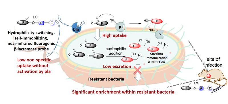 β-内酰胺酶在细菌中的表达是导致β-内酰胺抗生素耐药的主要原因,但同时也为在活体动物中监测细菌感染提供了独特机会。然而,由于动物活体本身是一个高度复杂、动态的环境,基于荧光探针对活体动物耐药细菌感染进行高质量成像仍然面临着诸多挑战。在本研究中,科研团队在前期亚甲基苯醌自锚定探针设计策略基础上(Chem. Sci. 2020, 11, 5889;Anal. Chem., 2020, 92, 15017;Angew. Chem. Int. Ed. 2024, 63, e202317773),发展出酶促多效应的β-内酰胺酶近红外荧光探针。该探针可以在β-内酰胺酶选择性促发下同时实现亲水-亲脂、共价键锚定、荧光开启等多重变化,使被酶激活的荧光分子高效富集在耐药菌中,从而实现在活体中对耐药细菌感染进行高质量、长时效荧光成像。相关研究对活体实时监测耐药细菌感染以及活体抗菌药物活性评估均具有重要价值。国产自拍