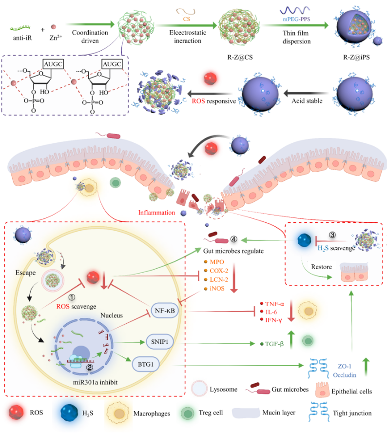 近日,国产自拍 高峰教授课题组又有新突破,首次提出一种能有效调控炎症结肠部位ROS和H2S等自由基水平的反义寡核苷酸和锌配位的纳米酶。同时,本研究在前期金属基配位靶向纳米递药平台设计策略,配位机制和构建研究的基础上(Asian J. Pharm. Sci.,2024,19,100858;Adv. Healthc. Mater.,2024,2024,2401869;ACS Appl. Mater. Interfaces,2025,17,617),首次将上述锌基配位纳米酶,联合壳聚糖和PEG修饰的聚丙烯硫醚[PEG-poly(propylenesulfide),PEG-PPS]组成的ROS响应杂合脂质纳米递药平台,用于同时实现anti-miR-301a的口服递送,自由基-炎症通路调节,肠道屏障和菌群恢复等多重功能,从而实现IBD的有效治疗。相关研究对反义寡核苷酸的口服递送以及IBD的微环境调控均具有重要价值。相关成果以“An anti-miR-301a and zinc coordination driven nanozyme loaded in nanoparticle for oral therapy of inflammatory bowel disease based on colitis microenvironment regulation”为题发表在国际权威学术期刊Chemical Engineering Journal上。国产自拍 博士研究生邹佳峰、硕士研究生夏传河为该论文共同第一作者,高峰为论文通讯作者。