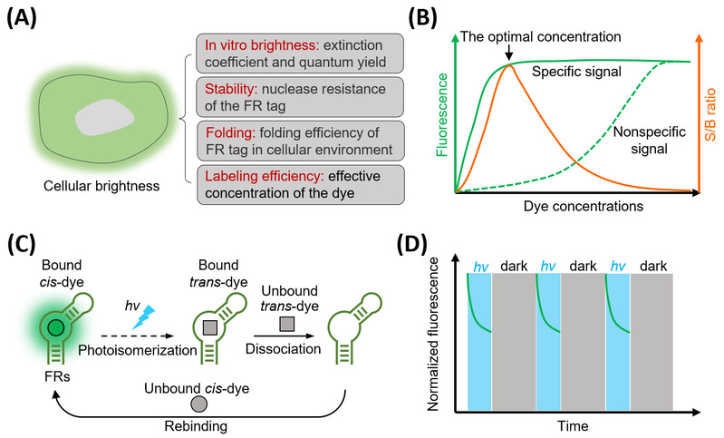 文章随后对利用荧光RNA进行活细胞RNA标记成像提出了一些建议,包括如何选择生物正交的荧光RNA进行多色RNA成像、如何选择合适的高亮度荧光RNA、如何优化染料的标记浓度获得高信噪比成像图片、如何对具有快速光切换性质的荧光RNA进行成像、以及如何选择合适的荧光RNA融合位点来减小对靶标RNA的干扰等。这些建议将会帮助研究人员更好地开展基于荧光RNA的活细胞RNA标记与成像,助力RNA生物学功能与调控机制研究。