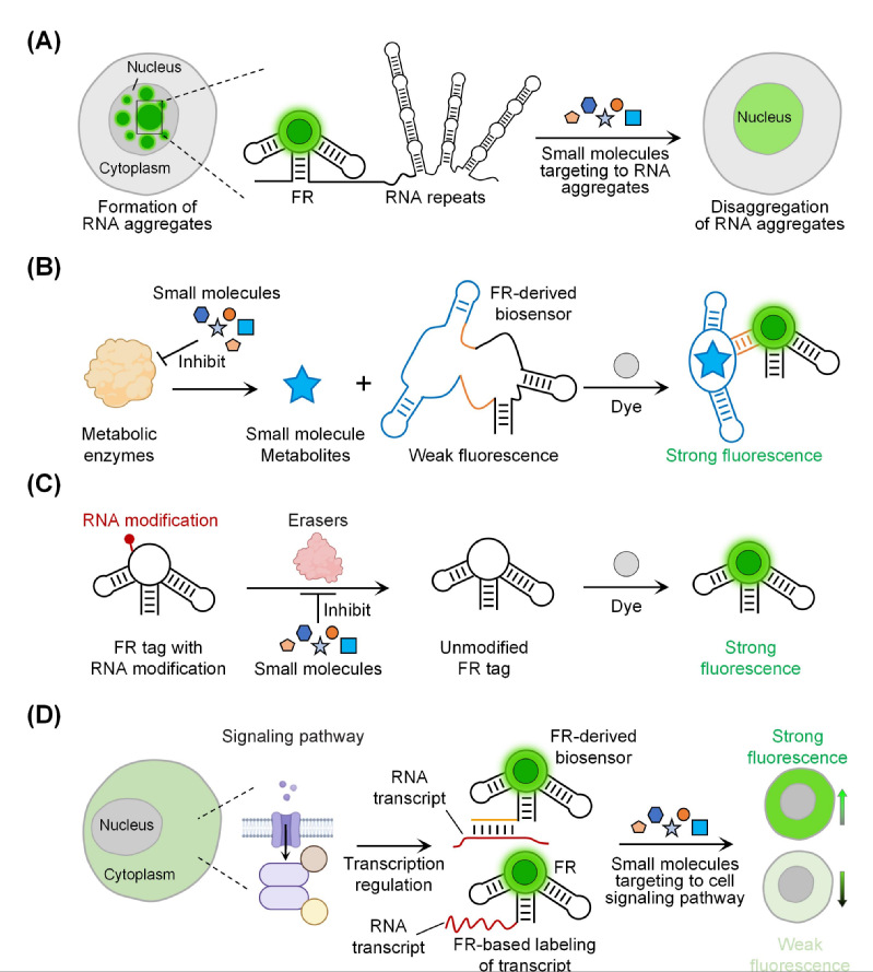 最后,文章指出荧光RNA技术可以助力小分子药物研发。除RNA药物外,FR在筛选靶向RNA的小分子先导化合物,以及针对生物酶或疾病相关信号通路的先导化合物方面,也具有重要作用。例如,相较于传统的FISH方法,FR能更直接地标记和成像RNA聚集体,从而便于通过高通量筛选寻找能诱导RNA聚集体解聚的小分子。FRB可通过体外和活细胞检测小分子代谢物,为靶向代谢紊乱疾病的药物研发提供可能。此外,通过对FR标签进行特定化学修饰,可将RNA修饰酶的活性与FR荧光信号关联,从而为筛选RNA修饰酶的抑制剂或激活剂提供一种通用方法。FR还可用于评估靶向细胞信号通路的小分子先导化合物对RNA表达的调控作用。这些应用进一步凸显了FR在药物发现中的多功能性及其潜在的临床应用前景。综上,FR和FRB技术已成为RNA生物学研究与药物研发的有力工具。未来,其将在加速安全有效药物的发现与开发中发挥关键作用,助力于预防和治疗各类疾病,从而改善人类健康。