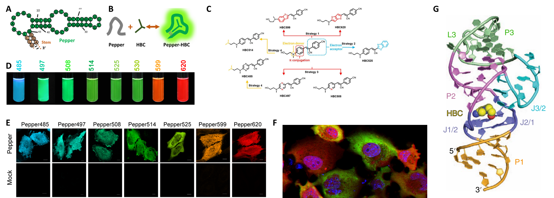 荧光蛋白技术是当代生物科学研究中最重要的颠覆性研究工具,点亮了细胞了各种蛋白质的动态。但人们在同样重要的荧光RNA领域进展十分有限。我们首次获得了系列高亮、稳定、低背景、不同颜色的荧光RNA,命名为Pepper。这些荧光RNA具有独特的三级结构,RNA与配体之间作用强烈,因而其荧光性能主要参数与现有技术相比方面提升了一到三个数量级,可有效标记活细胞内种类、丰度各异的RNA,体现了荧光RNA从概念到实用的突破,为活细胞中RNA的功能研究提供极具价值的工具。(Nature Biotechnology 2019, 37,1287; Nature Chemical Biology 2021, 17, 1289)