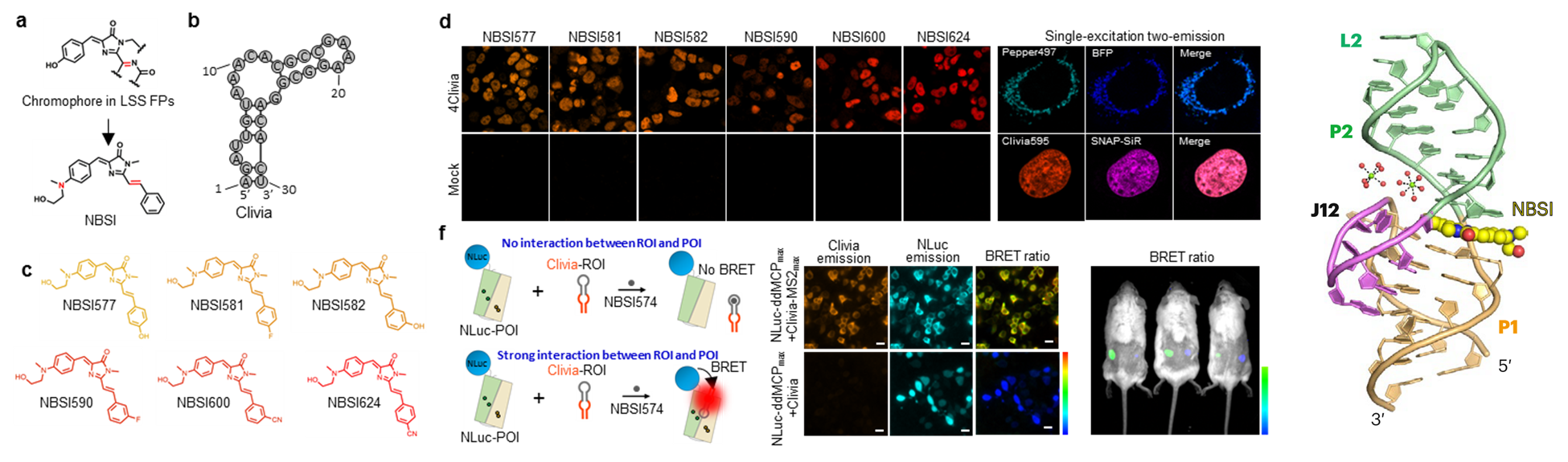 ---------------------------------------------------------------------------------------------------------------------------------------------------- Large Stokes shift fluorescent RNAs for dual-emission fluorescence and bioluminescence imaging in live cells 大斯托克斯位移荧光蛋白是进行多色荧光成像的理想工具,已被广泛应用于活细胞与活体蛋白质的多色荧光标记与成像,然而此前尚无活细胞可应用的高性能大斯托克斯位移荧光RNA工具。针对这一技术挑战,研究团队历经多年辛苦耕耘,最终在高性能大斯托克斯位移荧光RNA标记技术上取得了突破进展。团队基于全新的分子设计理念与分子共同定向进化策略,原创发展了国际上首个可用于细胞成像的Cliva大斯托克斯位移荧光RNA,实现了活细胞RNA与基因位点的单激光双发射多色实时成像,并进一步在活细胞与活体动物上完成了RNA-蛋白质相互作用的实时监测。晶体结构显示Clivia整体结构非常紧凑,呈纺锤型,配体与结合口袋之间通过完美的形状互补实现特异性识别。Clivia具有高稳定性、高信噪比、高亮度,是目前唯一可用于活细胞分析的大斯托克斯位移荧光RNA,也是唯一可在活体上对RNA动态进行测量的荧光RNA。Cliva将为活细胞与活体RNA的多色成像以及RNA功能与调控机制研究提供极具价值的实用工具,也有望为活细胞与活体生物传感、即时诊断甚至实时诊断技术的发展提供新的机遇。(NatureMethods 2023,20, 1563;Nature chemical biology 2024, 20, 1453)