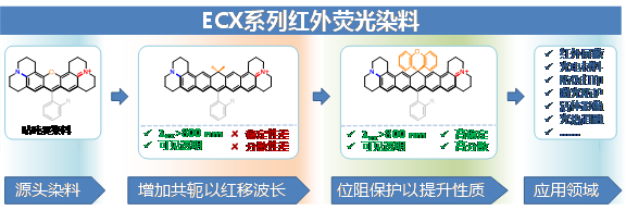 钱旭红院士团队杨有军教授课题组近期在高性能红外荧光染料开发方向取得突破。通过对氧杂蒽染料母核进行理性结构衍生,设计并合成了一个最大吸收波长大于800 nm的新型染料母核——二苯并碳罗丹明。进一步通过增加该母核周围空间位阻,成功开发具有高稳定性、溶解性的红外荧光染料,并将其命名为ECX系列染料。