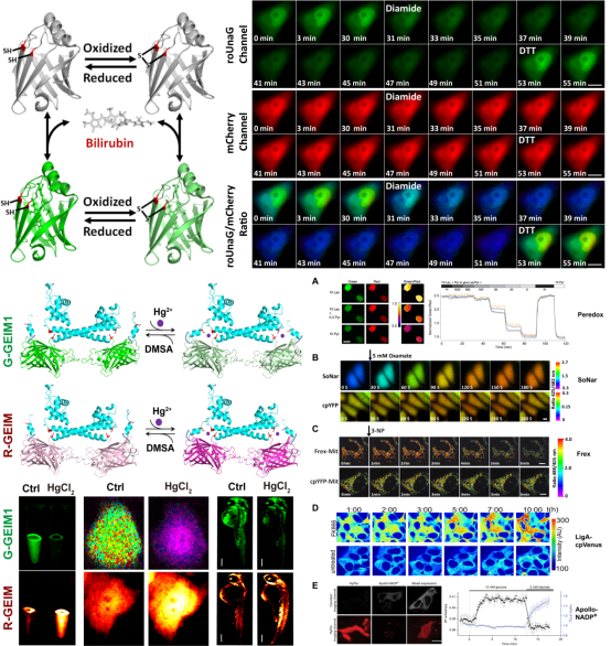设计构建了3种对汞离子特异性响应的基因编码荧光探针,该类探针可以实现nM级别的汞检测,并且响应速度快,动态范围大,特异性良好。利用该探针课题组实现了细菌、哺乳动物细胞不同亚细胞结构甚至斑马鱼水平内的汞检测及其与活性氧之间的关联探索。该研究为不同生物中对重要的环境污染物汞的分析提供了强有力的工具。同时红色、绿色的基因编码汞离子荧光探针丰富了汞离子检测工具的种类,能够与其他探针联用完成细胞甚至活体水平的多色成像,有望实现重金属离子与细胞氧化还原的多尺度分析(Free Radic Biol Med. 2018, 121, 26)。