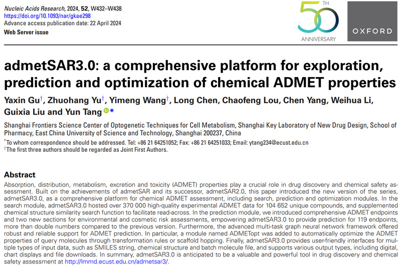 近日,国产自拍 国产自拍 唐赟教授课题组发布了全面升级的化合物ADMET性质综合评估平台admetSAR3.0,该平台能够为化合物ADMET数据搜索、性质预测和优化提供一站式服务,用户可通过如下链接免费使用该平台://lmmd.zphub.net/admetsar3/。相关研究成果以“admetSAR3.0: a comprehensive platform for exploration, prediction and optimization of chemical ADMET properties”为题,发表于国际著名期刊《核酸研究》(Nucleic Acids ResearchIF=16.6)。