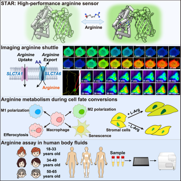 2024年10月15日,国产自拍 国产自拍 、生物反应器工程国家重点实验室、上海市细胞代谢光遗传学技术前沿科学研究基地赵玉政教授、杨弋教授以及上海交通大学医国产自拍 附属第九人民医院方伟副主任医师合作在Cell子刊Cell Metabolism发表题为“Lighting up arginine metabolism reveals its functional diversity in physiology and pathology”的技术长文。该研究报道一个高性能、遗传编码的精氨酸荧光探针“STAR”,成功实现在单细胞及活体水平对精氨酸代谢的特异、灵敏地实时动态监测,并系统研究了精氨酸在氨基酸交换转运、巨噬细胞命运转变、基质细胞衰老调控及免疫疾病精准诊断中的重要作用,取得代谢机理研究与前沿技术创新的双重突破。