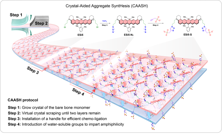 基于此,研究团队以前期基于硅罗丹明开发的共轭延长的高稳定性、高荧光亮度近红外染料二苯并硅罗丹明(ESi5)为基础,提出了一种晶体辅助聚集体合成方法(Crystal-Aided Aggregate SyntHesis, CAASH),成功构建了水溶性的短波红外染料聚集体。当阴离子为PF6-时,ESi5晶体结构中链内的分子呈斜向堆积(V-聚集),链间呈J-聚集排列,因此将其命名为JV-聚集体。基于晶体结构,研究团队进行合理的设计,通过在侧链以叠氮化、Click反应引入带负电荷的磺酸/羧酸根基团,利用亲水(磺酸根基团)/疏水(共轭结构)相互作用实现染料的自组装。该系列染料聚集体具有三个独特吸收峰:其中1038 nm处的红移吸收峰和696 nm处的蓝移吸收峰归属于链内V聚集,1098 nm处的红移吸收峰归属于链间J聚集。最大发射波长位于1106 nm,表明Stokes位移仅8 nm。其在水溶液中的聚集形貌通过透射电镜、冷冻透射电镜、原子力电镜交叉验证为厚度3.4 nm的纳米丝带状结构。并且通过光/化学/热稳定性的测试验证了其具有优异的稳定性,其在水中解聚温度(aagg=0.5)超过70 oC,并且解聚后降低至室温又快速重新聚集。