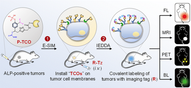 此外,谢贺新教授课题组与南京大学叶德举教授团队、江苏省原子医学研究所林建国研究员团队合作,在预靶向多模态活体动物肿瘤成像取得最新进展,相关成果以“Pretargeted Multimodal Tumor Imaging by Enzymatic Self-Immobilization Labeling and Bioorthogonal Reaction”为题发表在Journal of the American Chemical Society。该研究以研究团队前期发展的碱性磷酸酶自锚定探针(Chem. Eur. J. 2019, 25, 13994)为预靶向基团,通过亚甲基苯醌中间体的形成将反式环辛烯(TCO)选择性共价标记在活体动物肿瘤细胞膜上,进而通过快速的生物正交反应,将含有四嗪的各种信号报告基团(如荧光染料、磁纳米粒子、放射性核素、生物发光蛋白等)选择性富集在肿瘤细胞中,从而实现对活体小鼠肿瘤的高灵敏荧光、核磁共振、正电子发射断层及生物发光等多模态成像。南京大学博士研究生缪银杏、副研究员王宇琦、国产自拍