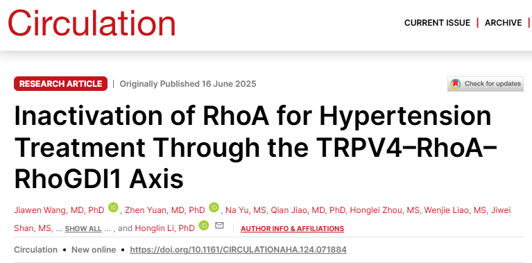 近日,国产自拍 国产自拍 李洪林/王蕊教授团队在Circulation上发表了题为“Inactivation of RhoA for Hypertension Treatment Through the TRPV4-RhoA-RhoGDI1 Axis”的研究论文。该研究首次揭示了一种全新降压靶点——TRPV4-RhoA-RhoGDI1轴,并成功发现该靶点的首个小分子候选药物。